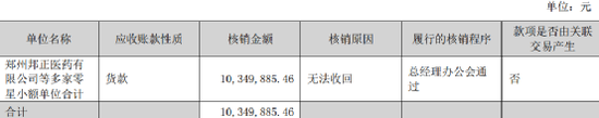 比如,无法收回并核销的应收账款中,有一笔涉及郑州邦正医药有限公司等多家零星小额单位合计的贷款,核销金额达到1035万元。