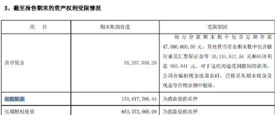 如上图所示,2022年末贵州百灵有1.7亿元的应收账款处于资产权利受限的状态,主要为借款提供质押。同期,另有6.53亿元的长期股权投资也受限,同样因为为借款提供质押。