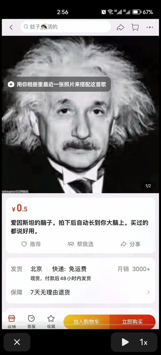 看起来,淘天换了换它的“脑子”。在淘宝上,近期陆续出现了一些奇怪的商品,例如一颗标价5毛钱的“爱因斯坦的脑子”,显然这是一款专门为Z时代定制的虚拟商品,商品链接显示,它的月销超过了3000件。