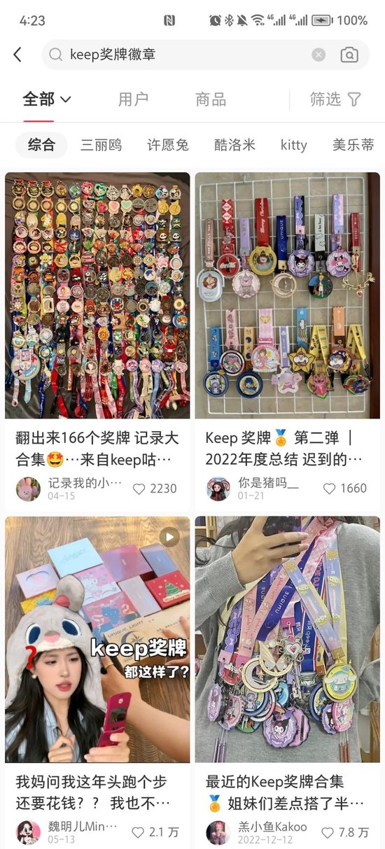 如今打开小红书搜索“Keep奖牌徽章”,你能找到1万+篇笔记和200+商品。在博主的疯狂种草下,Keep和柯南、魔卡少女樱、海绵宝宝等顶流IP的联名徽章早已成为一种社交货币,也为Keep积攒了新一波人气。