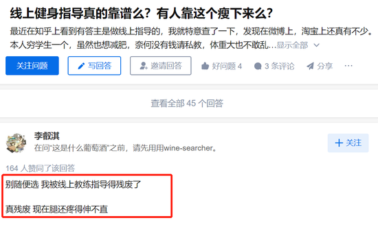 在知乎上搜索“你会在网上买健身课吗”、“线上健身会一直火吗”、“线上健身指导真的靠谱吗”等问题,下方高赞回答一边倒的否定。答主“rocky”表示,自己一直自己徒手练习效果也不差,更有昵称为“李叡淇”的知乎答主控诉,自己被“线上教练指导到差点腿都要废了”。