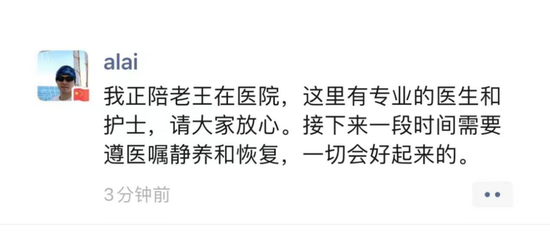 随后,王慧文密友,前美团高管、美团创始团队之一的赖斌强表示,此时他正陪王慧文在医院,让大家放心,并表示接下来的一段时间需要遵医嘱静养和恢复,一切会好起来。