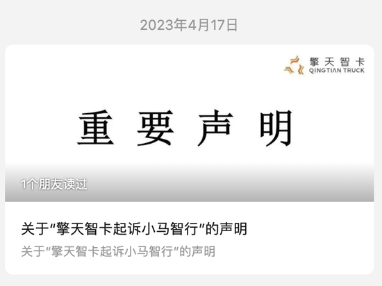 受困于此,今年4月17日,擎天智卡在其官方公众号发“重要声明”称,自去年8月小马智行起诉其侵犯商业秘密以来,公司多次主动向小马智行发起沟通未获有效回应。