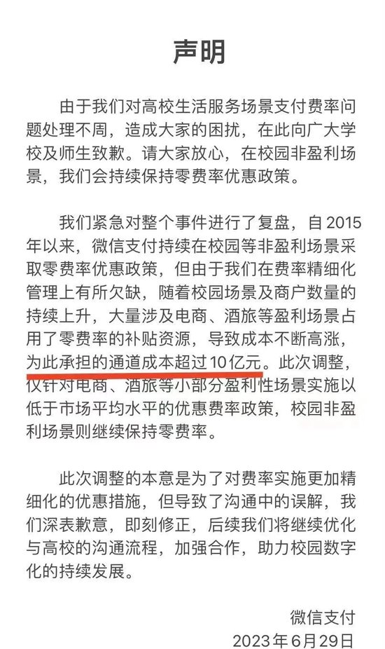 从腾讯的表态来看,此次调整是为了对费率实施更加精细化的优惠措施,校园内非盈利性支付场景挤占零费率的教育补贴资源,导致成本不断增加,在第二次回应的“秒删” 版本中,微信支付透露“为此承担的银行通道成本超过10亿元”。