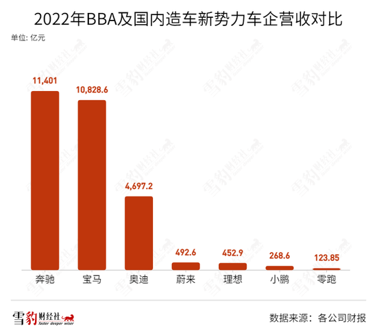 同一年,蔚来、理想、小鹏、零跑的销量均为10万辆出头,营收分别为492.6亿、452.9亿、268.6亿和123.85亿元,不到BBA的1/10。
