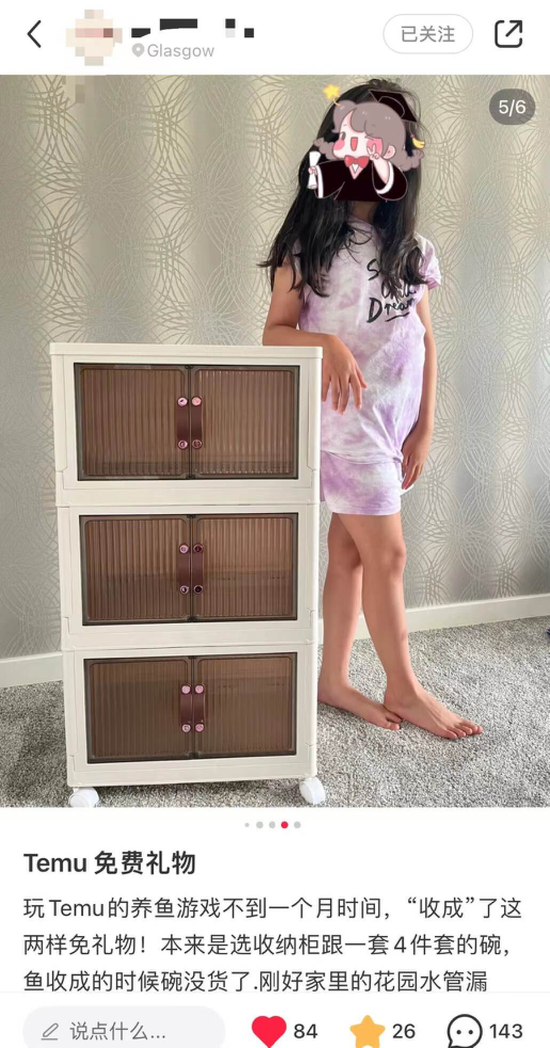 最近,英国苏格兰格拉的家庭主妇Amy收到了拼多多跨境电商平台Temu寄来的免费礼物——收纳柜和水管。
