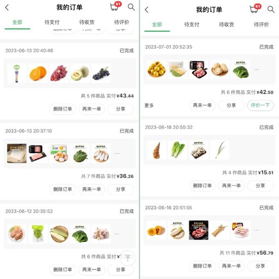 第一单出现在6月12日。那天晚上8点多,她原本只是想买点第二天中午带饭的原材料,打开叮咚买菜,发现晚间市集,眼睛一亮。最后,她下单了1斤鸡胸肉、300克切好的青笋片、900克西葫、300克有机西兰花、500克紫皮大蒜,一共花了23.82元——相比原价,打了4.8折。其中,大蒜还是原价买的。