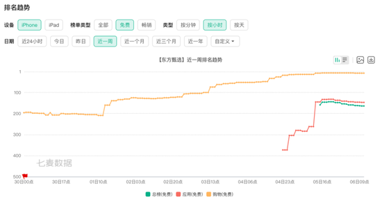 动态数据方面,借鸡生蛋的效果平平。据七麦数据显示,自从7月4日官方发布自建应用直播后,东方甄选App在iOS下载的总榜(免费)、应用(免费)、购物(免费)上从没有位次,最高分别来到第144位、第132位、第7位。