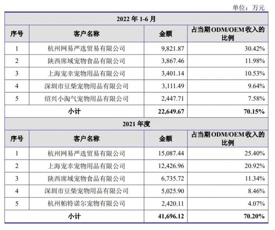 福贝宠物招股书透露,凭借先进的生产工艺技术、良好的产品质量及较高的市场知名度,与国内多家知名宠物品牌商如网易严选、豆柴、帕特等客户建立了稳定的合作关系。过去3年半里,网易严选一直是福贝宠物的第一大客户,2022年上半年网易严选为福贝宠物贡献了当期ODM/OEM收入的30.42%。