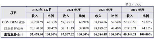 但福贝宠物的主营业务依然是“代工”。招股书显示,2019-2022年上半年,福贝宠物的自主品牌业务营收占比分别为44.15%、42.46%、39.09%、38.47%;而ODM/OEM业务占比则分别为55.85%、57.54%、60.91%、61.53%。自主品牌业务占比在逐渐下降,而代工业务所占比重越来越大,福贝宠物越来越像一家代工厂,加上公司体量在行业相对较大,因此也被冠以“宠食界富士康”的名号。