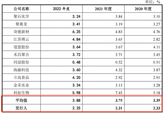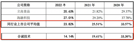 以自产酱料毛利率情况为例,报告期内,公司自产酱料的毛利率分别为33.30%、19.41%和14.14%,2022年,毛利率相对2020年直接“腰斩”,下降了19.16个百分点。而该业务的同行公司立高食品、海融科技的毛利率平均值分别为33.57%、25.51%和23.82%,远高于合诚技术。