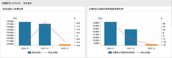 招股书显示,2020年-2022年(以下简称“报告期”),合诚技术的营业收入分别为17.78亿元、17.71亿元和16.98亿元,同比增长-4.59%、-0.38%和-4.09%;同期归母净利润1.40亿元、1.25亿元和9375.49万元,同比增长41.12%、-10.96%和-24.75%。营收和净利润均处于连年下滑的状态。