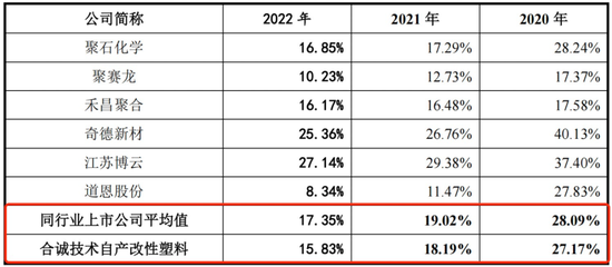 具体从自产产品来看,报告期内,合诚技术自产改性塑料业务的毛利率分别为27.17%、18.19%和15.83%,同行业上市公司毛利率平均值分别为28.09%、19.02%和17.35%,合诚技术毛利率不仅逐渐下滑,且一直低于同行公司水平。
