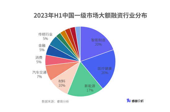 睿兽数据显示,2023年H1中国一级市场41起大额交易事件,分布在智能制造、医疗健康、新能源、材料、汽车交通等多个领域。其中智能制造和医疗健康领域,今年上半年均发生8起大额交易,占比均为20%。排在之后的为新能源领域,大额交易事件7起,占比17%。如下图所示: