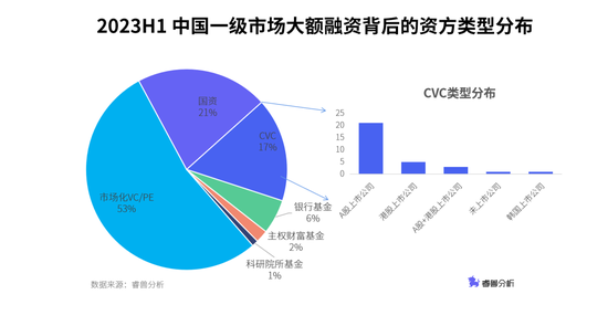 中国一级市场,产业资本正在逐渐成为中坚力量。仅以2023年上半年大额交易中,CVC参与程度来看,近200多家资本中,有33家为CVC,占比近17%。具体来看: