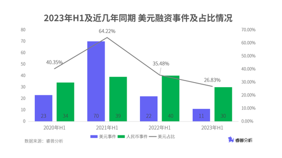 国资深度参与中国一级市场大额交易的同时,美元基金逐渐被边缘化也成为一种共识。从睿兽分析数据来看,2023年H1,中国一级市场大额交易中,美元仅11起,占同时期大额交易数的26.83%。同比来看,2021年H1,美元是大额交易中的强势存在,合计109起大额交易中,美元有70起,占比64.22%,较2020年H1,增加47起,占比提升近24个百分点。