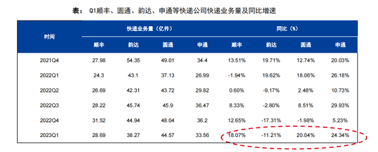 进入2023年以来,一季度网上零售增速已恢复至10%,其中实物网上销售额较网上服务零售额保持更高的增长水平,一定程度上说明快递业务量保持较高增速的韧性基础,同时,在三年的不确定因素消失后,2023年Q1全国快递量增速得到了很大程度上的修复:Q1顺丰、圆通、申通等快递公司快递业务量的同比增长分别为18.07%、20.04% 和24.34%。