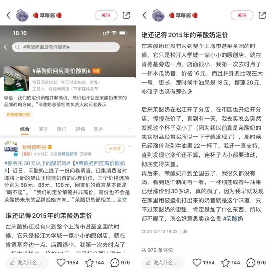 在“茉酸奶新品问卷价格选项最低68元”、“茉酸奶回应高价酸奶”、“喝茉酸奶5天胖了6斤”、“茉酸奶应该叫莫奶昔”等相关热搜话题之下,茉酸奶陷入舆论的旋涡。