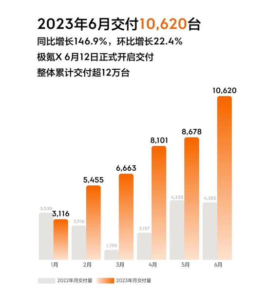显然,极氪年初销量的“重挫”给2023年留下了“可喜”的增长基础,这也是上半年数据好看的根源。