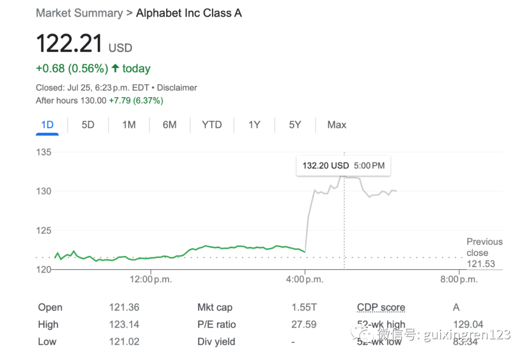 谷歌本季度的亮眼财报表现也直接体现在了股价上。今日美股盘后,谷歌股价一度大涨超过7%。