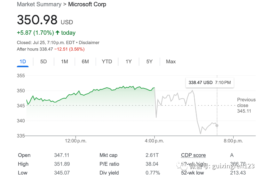 受到微软云业务增速放缓和低业绩预期的影响,微软股价在盘后一度跌超3%。