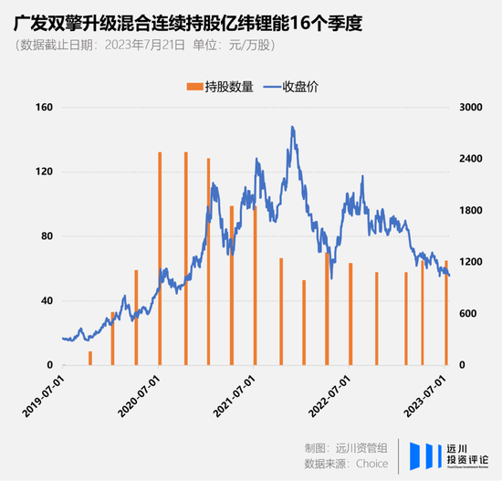 自从2020年依靠重仓新能源取得了不菲的业绩之后,刘格菘对于新能源的信仰似乎也在逐渐加深,在过去三年当中持续对新能源相关行业进行重仓。以其代表产品之一广发双擎升级混合为例,在产品成立的第二个季度就曾布局了动力电池行业的公司亿纬锂能,即便该公司经历了大幅调整,其依然位列产品的前十大重仓股直至今日。