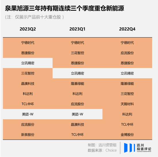 2022年,赵诣加入泉果并发行了第一支产品泉果旭源三年持有期混合。其依然选择从新能源行业开始进行缓慢建仓。根据Choice相关数据统计,自该产品成立起前十大重仓股中有半数以上均为新能源行业相关个股。在最新一季度中其虽然大幅减持了隆基股份,但新能源车相关个股新泉股份取而代之,成为了新进前十大重仓的个股。