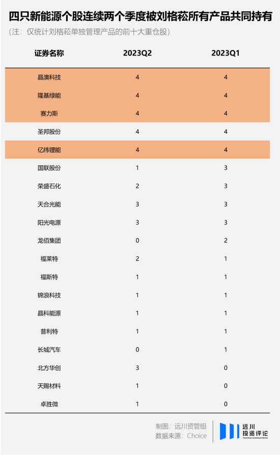 而在最新的一个季度,根据Choice相关数据统计,刘格菘旗下单独管理的产品依然高度布局新能源行业,同时持仓相较于前一个季度并没有发生明显的变化,而能够连续两个季度同时在旗下四只产品中位列前十大的重仓股中有四只为新能源相关个股。