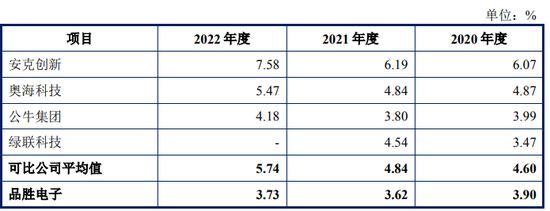 从研发投入来看,报告期内,公司研发费用分别为4451.57万元、4803.63万元与4957.27万元,研发费用率分别为3.90%、3.62%与3.73%。同期品胜电子可比公司研发费用率的平均值分别为4.60%、4.84%与5.74%。