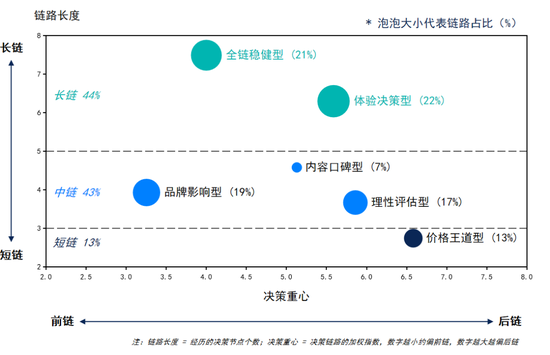 基于以上研究,进一步联系品类特性后,白皮书通过受众的触媒及消费共性梳理,得出了汽车决策链路的六大分型:体验决策型、理性评估型、全链稳健型、价格王道型、品牌影响型、内容口碑型。