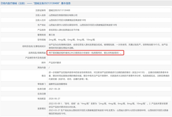 根据注册证信息,该产品用于面部真皮层填充以矫正额部动力性皱纹,包括眉间纹、额头纹和鱼尾纹。