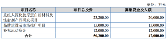 据招股书,锦波生物此次在北交所发行新股,拟投入募集资金4.7亿元,用于重组人源化胶原蛋白新材料及注射剂产品的研发、品牌建设及市场推广、补充流动资金。