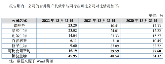 截至2022年底,锦波生物资产负债率45.95%,这一负债水平在生物科技类公司中并不多见,远高于同行可比公司的平均值15.19%。