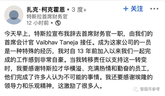 就挺突然的,特斯拉功勋CFO,马斯克继承人的潜在人选,Zack 扎克(扎克·柯克霍恩),今天突然辞职了。