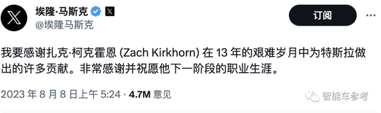 扎克随后在领英上对此进行了回应,称为自己13年来的工作而感到自豪,对特斯拉和马斯克表达了感谢。