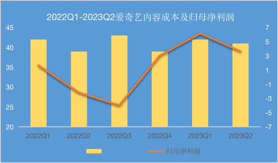 拉长时间轴来看,从2022年Q1到2023年Q2,爱奇艺的内容成本始终维持在40亿元上下,在2022年Q4,受到整体长视频市场减少上新的影响,爱奇艺的内容成本更是一度低至39亿元。
