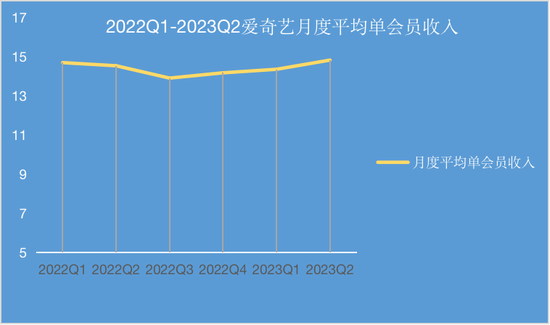 根据财报数据,2023年Q2,爱奇艺虽然会员数环比减少了1700万,但月度平均单会员收入却从Q1的14.35元增长至14.82元,环比上涨3%。而从2022年Q3以来,爱奇艺的月度平均单会员收入便呈现持续上升的趋势。