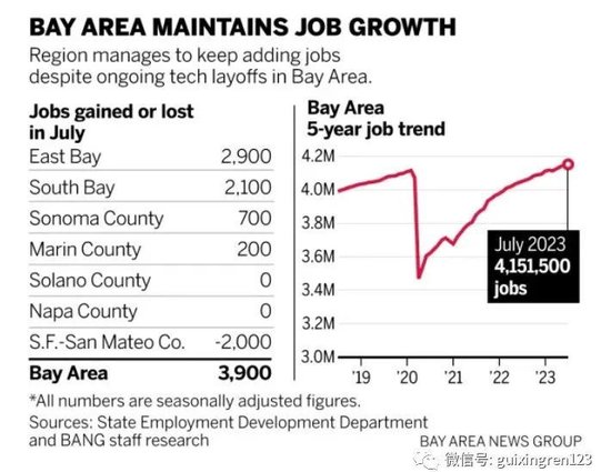 具体到旧金山湾区,根据《圣何塞信使报》援引加州就业发展局信息:旧金山湾区7月份新增3,900个就业岗位,远低于4、 5月份超12,000个的强劲增长。不过即使总体就业增长放缓,科技行业仍在7月份推动了本地就业市场的大部分改善。据Beacon Economics评估,随着裁员数量大幅减少,7月高科技公司在南湾新增了1,000个工作岗位,在东湾新增了700个工作岗位,在旧金山-圣马特奥地区新增了100个工作岗位。