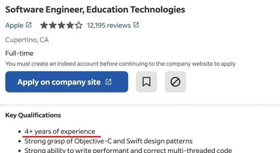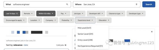 打开著名招聘网站Indeed,在求职岗位输入“Software Engineer”,条件设定为“过去14天里、以圣何塞为中心的 50英里范围内”,可看到共发布包含Full-time,Contract等在内1343个职位。其中Mid和Senior level占了65%,Entry level只有242个。