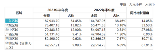 虽然东鹏饮料的“大本营”广东区域贡献了34.45%的主营业务收入,仍然是绝对的销售主力,但增速仅有14.05%,仅高于广西区域的6.98%,明显低于整体营收增速。