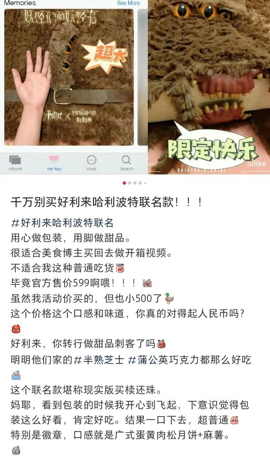 在联名爆品的加持下,好利来交出了不错的业绩,但是伴随联名款而来的是消费者对其既贵又难吃的评价。有测评博主测评了折后579元的好利来和哈利波特的联名礼盒,IP是好IP,创意是好创意,但味道则一言难尽。在小红书上,用户对联名款的吐槽声更是此起彼伏,不少人称,“包装造型有多好看,口感就有多敷衍”。