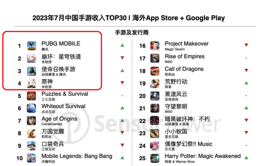 前不久,Sensor Tower发布了最新的2023年7月中国手游出海榜单,腾讯的《PUBG Mobile》将《崩坏:星穹铁道》拉下马,成功位居榜首。