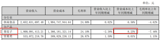 在营收下滑的情况下,葵花子产品的营业成本仍在上升。2022年半年报显示,葵花子产品营业成本比上期增加15%,而一年后,成本再度增加8.25%,导致毛利率同比下滑7.46%。