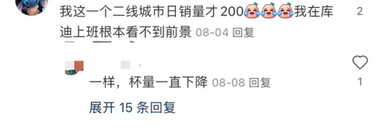 随着库迪频频提价,不少库迪加盟商开始在小红书、抖音等社交平台“现身”,表示其销量下滑明显。一位库迪的员工透露,“一个二线城市的日销量才200杯,在库迪上班看不到前景。”也有网友分享楼下装修三个月,开了一个月的库迪闭店的消息。