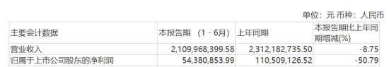 2023年中期财报显示,报告期内,公司实现营业总收入21.10亿元,同比减少8.75%;归母净利润5438.09万元,同比大跌50.79%。