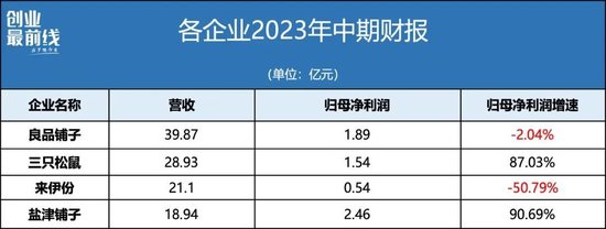 从行业角度来看,来伊份似乎正在掉队。据「界面新闻·创业最前线」不完全统计,和同梯队的三只松鼠、良品铺子、盐津铺子相比,来伊份的归母净利润最低,并且下滑幅度最大。