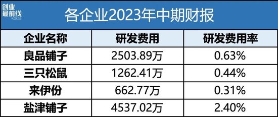 财报显示,2023年上半年,来伊份投入研发费用662.77万元,研发费用率0.31%。同期,良品铺子、三只松鼠、盐津铺子分别投入了2503.89万元、1262.41万元、4537.02万元,研发费用率分别为0.63%、0.44%、2.40%。