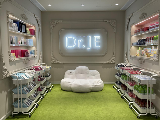欧式复古风的8列货架、6列橱窗整整齐齐摆放着Dr.JE的面膜、洗护及各种美容产品。转过身来,对面也码了一墙产品,甚至在收银台、咖啡厅的结账处,也都是Dr.JE的身影。