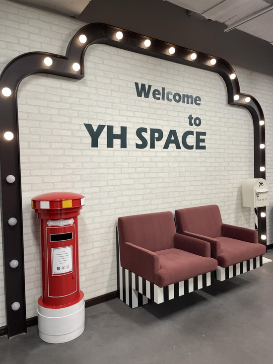 推开大门,率先映入眼帘的是左手边英伦复古风格的打卡地,霓虹灯光闪烁,白色砖体墙面上写着“Welcome to YH SPACE”,两张砖红色沙发椅和红色邮筒供粉丝们打卡拍照,旁边的硕大电子屏则轮番滚动当家艺人们的舞台瞬间。
