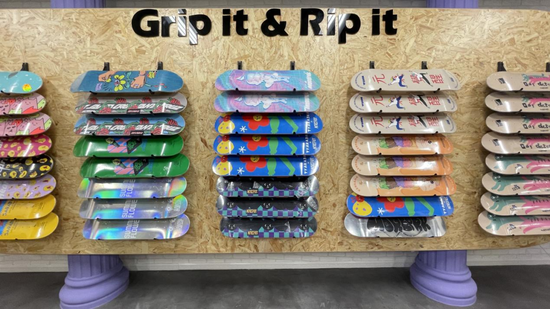 游玩区分为两大块,一块是与知名滑板培训品牌MOREPRK合作的滑板区,一面墙上全是滑板,明星同款早已售罄,剩余款式最便宜的280元,最贵的680元。另一面则陈列着滑板用具,你很难注意到,墙边还有一块程潇的人形立牌。